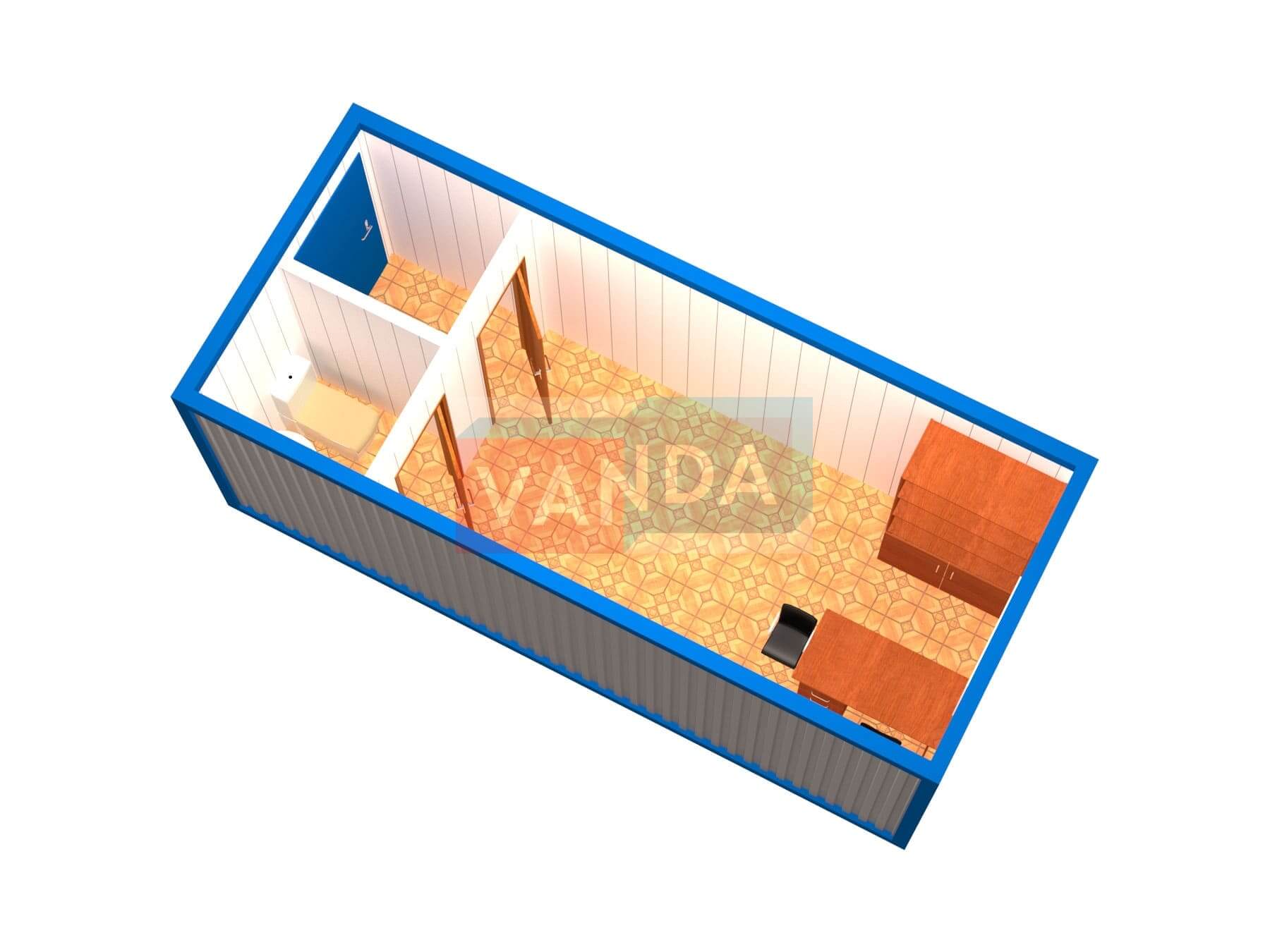 Блок контейнер офисный с туалетом №6 (вариант 1) изготавливается из несущего каркаса (верхняя и нижняя обвязка): швеллер 120х50х3 мм., угловые стойки: сложно - гнутый угол 90х90х3 мм., крыша блок-контейнера: металл сварной 0,9-1 мм., качественная наружная отделка: оцинкованный профлист, внутренняя отделка стен: Панели ПВХ, внутренняя отделка потолка: Панели ПВХ, вспомогательный деревянный каркас (стены): брусок 40х75 мм., лаги пола: обрезная доска 40х100 мм., лаги потолка: обрезная доска 40х100 мм., выполнено утепление: Минеральная вата «ISOVER» – 100 мм. и пароизоляция: плёнка техническая, черновой пол состоит из: обрезная доска 20 мм. (2 сорт), чистовой пол покрыт: ДСП строительное 16 мм., отделка пола: линолеум полукоммерческий. Контейнер комплектуется окнами: ПВХ однокамерное, одностворчатое, п/о 900х1100, входной дверью: металлическая, утеплённая (Россия) и внутренними дверями: МДФ (при наличии перегородки). Если в БК присутствуют перегородки, то для них используется: брусок 40х50 мм.